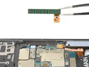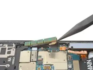 Используйте заострённый конец лопатки, чтобы поддеть и отключить пресс-коннектор антенны NFC от платы.