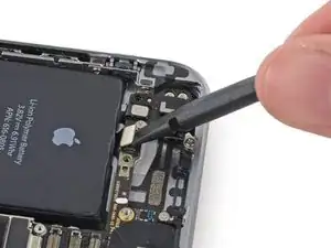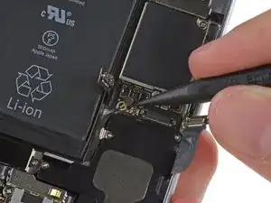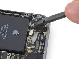 Снимите металлический кронштейн разъёма аккумулятора с iPhone.