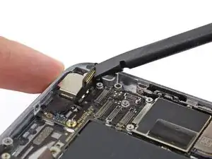 Используйте плоский конец лопатки, чтобы отсоединить кабель сборки разъема Lightning и отогнуть его в сторону от динамика.