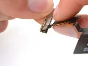 Вставьте плоский конец лопатки или чистого ногтя под верхний край пресс-коннектора кабеля дисплея и подденьте прямо вверх, чтобы отсоединить его.