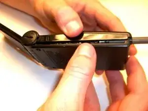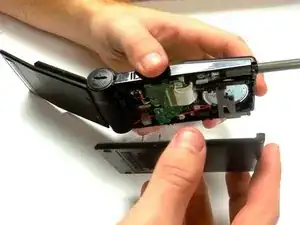Найдите два серебряных винта рядом с петлей, где размещен аккумулятор.