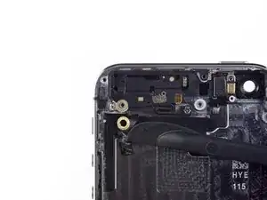 Во время сборки вам необходимо установить скобу кабеля Touch ID. Верхняя часть скобы должна заскользить между аккумулятором и разъемом кабеля Touch ID, перед металлической вкладкой. Нижняя часть должна защелкнуться над разъемом.