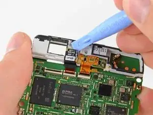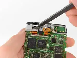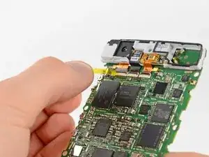 Подденьте кончиком лопатки антистатическую ленту, закрывающую разъёмы шлейфов камеры и динамика, и приподнимите её.