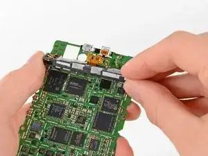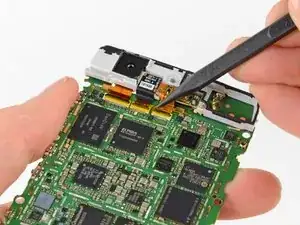 Ослабьте три винта T3 Torx длиной 2,5 мм, крепящих металлический каркас к материнской плате.