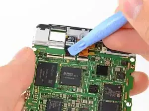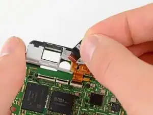 На материнской плате есть небольшой металлический экран, закрывающий разъёмы кабеля дисплея. Этот экран удерживается на месте несколькими маленькими защелками, прикреплёнными к окружающим экранам ЭМП.
