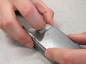 Сдвигая серую защёлку вверх, приподнимите батарею и отведите её от телефона.