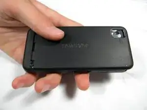 Нажмите на заднюю крышку и сдвиньте её вперед к камере.