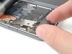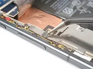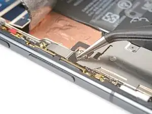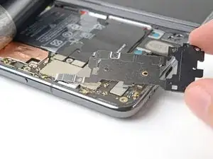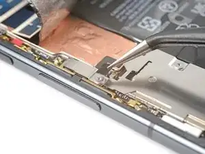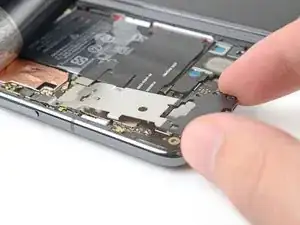 Используйте пинцет или пальцы, чтобы потянуть среднюю планку к левому краю телефона и освободить её защёлку.
