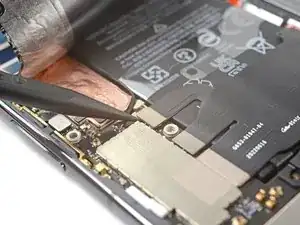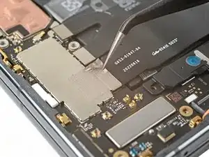 Снимите новую проводящую ленту с подложки и приклейте липкую сторону к разъёму нижнего межсоединительного кабеля, убедившись, что она перекрывает плату логики.