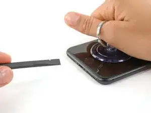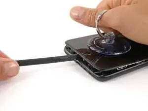 Водонепроницающий клей, удерживающий дисплей, очень прочный; создание начального зазора требует значительного усилия. Если вам трудно открыть зазор, покачайте экран вверх-вниз, чтобы ослабить клей, пока не сможете вставить лопатку.