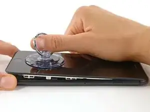 Подтяните присоску с равномерным, постоянным усилием, чтобы создать небольшой зазор между передней панелью и задней крышкой.