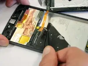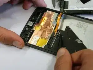 Язычок может легко порваться. Если это произошло, используйте лопатку, чтобы отделить угол батареи от телефона.