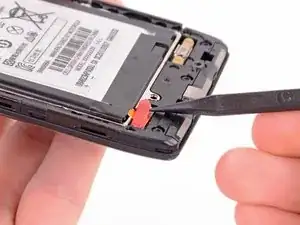 Используйте конец лопатки, чтобы приподнять красную силиконовую крышку над винтами терминала батареи и снять её.