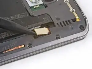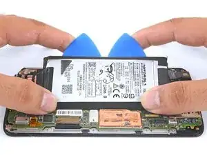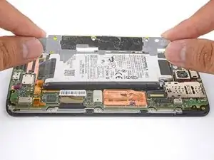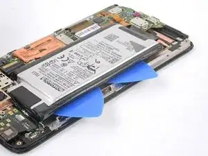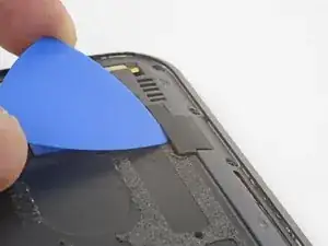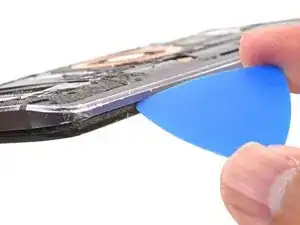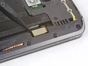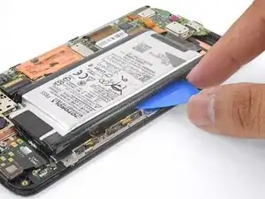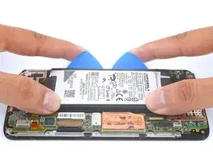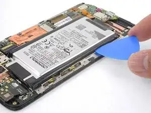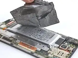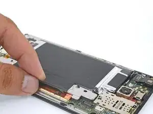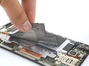 Аккумулятор прикреплён к корпусу сильным двусторонним скотчем. Чтобы помочь освободить аккумулятор, нанесите немного изопропилового алкоголя высокой концентрации (90% или выше) под аккумулятор, чтобы ослабить клей.