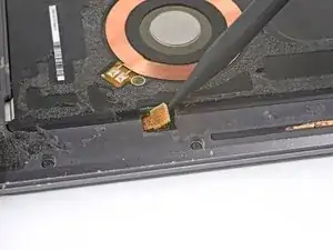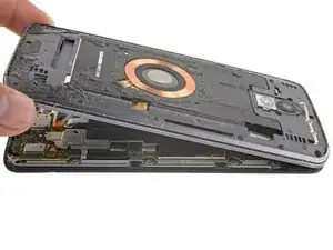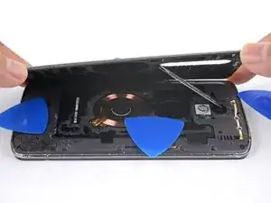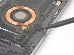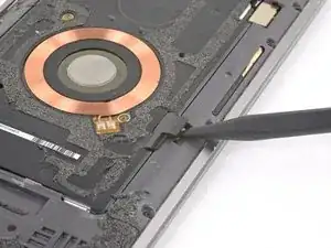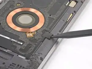 Используйте острый конец лопатки, чтобы поддеть и отключить разъем катушки беспроводной зарядки.