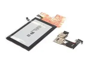 Сначала удалите батарею вместе со сборкой считывателя карт. Затем отделите их. Сгиб батареи зажат сзади сборки считывателя карт.