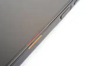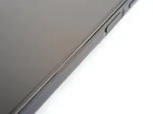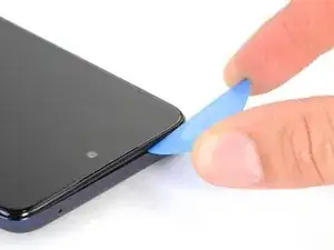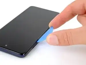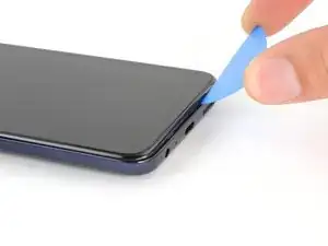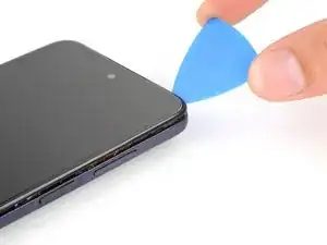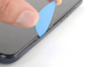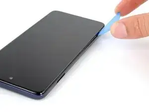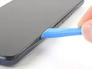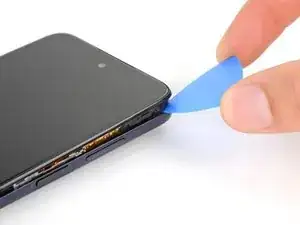 Вставьте инструмент для вскрытия в шов рамки на полпути между нижним правым углом телефона и кнопкой питания.