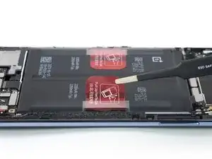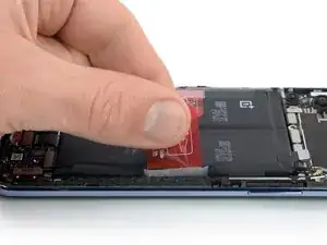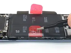 Используйте тупые пинцеты или пальцы, чтобы снять левую ленточную вкладку с батареи.