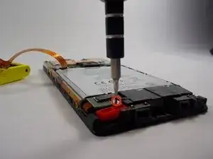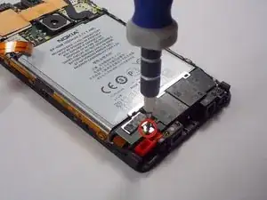 Используйте отвёртку T4 Torx, чтобы удалить винт 3 мм (диаметр шляпки 1.5 мм), закрепляющий металлическую защёлку, удерживающую батарею.