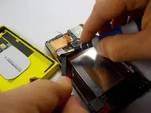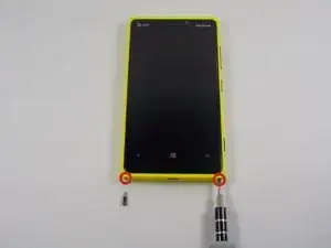 После удаления обоих винтов внизу и извлечения пластиковой защитной детали SIM-карты, аккуратно нажмите на внешнюю сторону экрана.