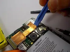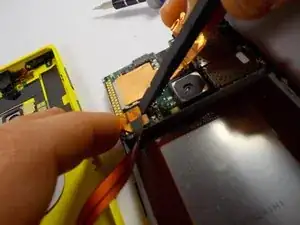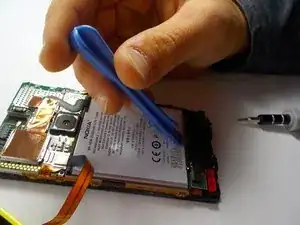 Используя пластиковый инструмент для открытия, подденьте металлическую защёлку, удерживающую батарею.