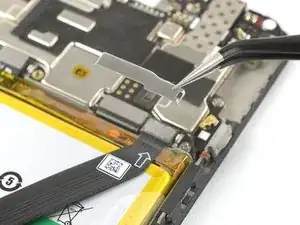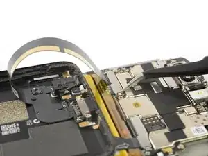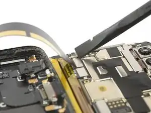Используя пинцет, снимите маленький металлический щит, который закрывает коннекторы шлейфов батареи, разъёма зарядки и разъёма наушников.