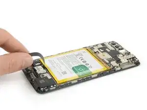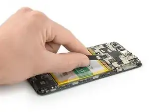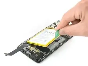 Хотя такого рода клейкая вкладка должна облегчать снятие аккумулятора, может потребоваться приложить силу. Если у вас возникают трудности с извлечением аккумулятора, можно приложить нагретый iOpener к центру дисплея, чтобы ослабить клей под ним.