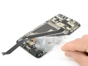 Старайтесь пока не полностью снимать заднюю крышку. Шлейфы датчика отпечатка пальца, разъёма зарядки и разъёма наушников по-прежнему подключены к плате.