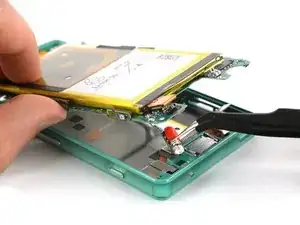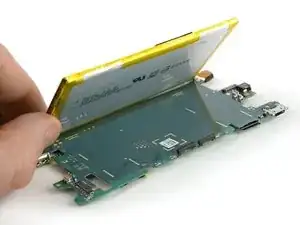 Будьте осторожны! Нужно протянуть гибкий кабель дисплея через зазор в материнской плате при её приподнимании. Он также соединён с мотором вибрации, который всё ещё приклеен к телефону.