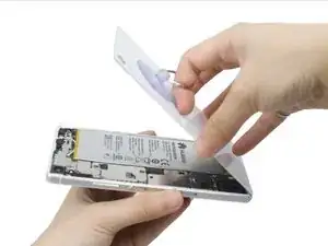 Отсоедините разъем батареи и аккуратно подденьте батарею. Внимание: под батареей находится сильный клей, выделенный красным кругом. Очень трудно разрезать клей. Кроме того, будьте осторожны с шлейфом под батареей при поддевании.