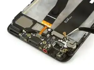 Пока не открывайте телефон полностью. Гибкий кабель кнопки включения и регулировки громкости всё ещё подключён к задней крышке.