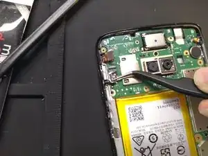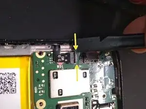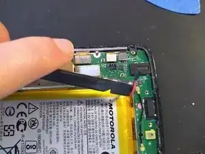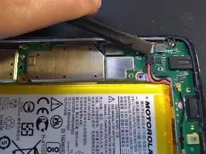 Поднимите чёрный антенный кабель от места рядом с моторчиком вибрации, чтобы он освободился от рамки.