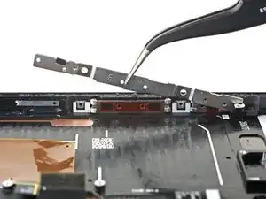 Используйте отвертку Torx T3, чтобы удалить два винта 2,4 мм, фиксирующие кронштейн кнопок к рамке.