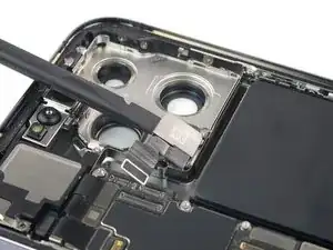 Используйте лопатку, чтобы отключить кабель ультраширокого и телефото объективов, поддев разъём и подняв его прямо вверх из гнезда.