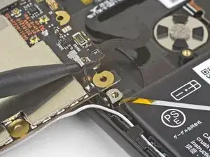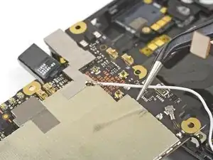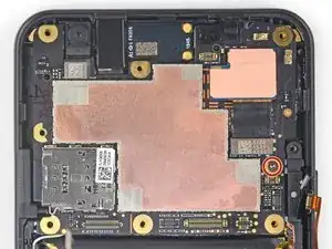 Удалите один винт T3 длиной 2,7 мм, крепящий материнскую плату возле правого края.