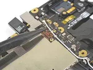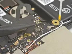 Используйте острый конец лопатки, чтобы приподнять и отключить чёрный антенный кабель от разъёма на плате.