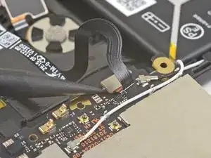 Используйте острый конец лопатки, чтобы приподнять и отключить белый антенный кабель от разъёма на плате.