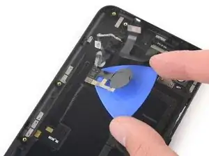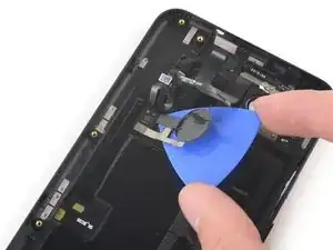 Сдвиньте медиатор вдоль правого края телефона, чтобы освободить пластиковые защёлки, фиксирующие заднюю крышку к средней рамке.