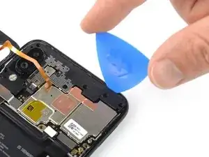 Осторожно подведите медиатор для вскрытия под короткий оранжевый гибкий кабель с ZIF-коннектором сверху, чтобы отделить его от заднего стекла.