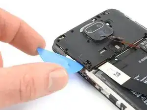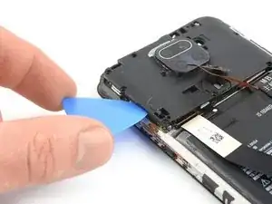 Проведите лопатку к нижнему правому углу, чтобы разрезать клей и освободить пластиковые защёлки, удерживающие заднюю крышку.