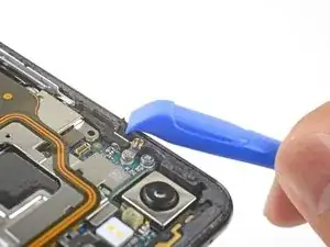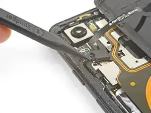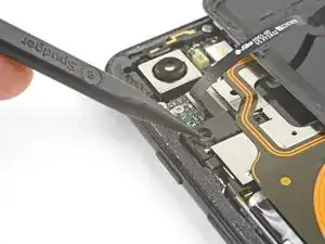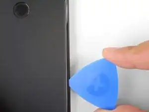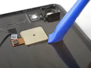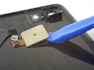 Вставьте край инструмента для вскрытия под выступ датчика отпечатков и подденьте, чтобы ослабить датчик от задней крышки.
