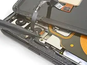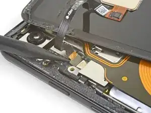 Используйте острый конец лопатки, чтобы сдвинуть кронштейн разъёма датчика отпечатков из-под катушки NFC.