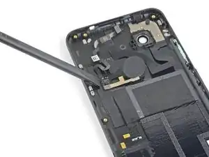 Используйте плоский конец лопатки, чтобы отогнуть кабели сканера отпечатков пальцев, приклеенные к внутренней стороне задней крышки.
