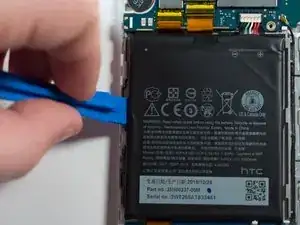 Поместите пластиковый инструмент для вскрытия сбоку от батареи и заведите его под батарею. Медленно и аккуратно подденьте батарею, отрывая её от клея под ней.