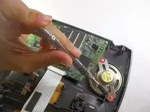 Найдите динамик в верхнем левом углу основания на изображении. Это серебристый конусообразный компонент. Два винта Phillips #0 длиной 7 мм держат динамик на месте.