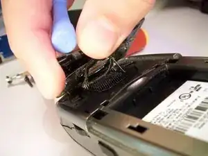Снимите крышку громкоговорителя, отжав два фиксатора по краю около верхней части телефона с помощью пластикового инструмента для вскрытия.
