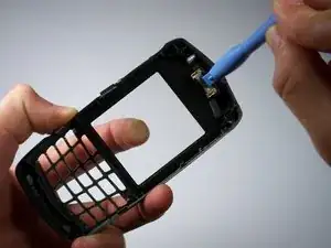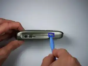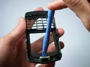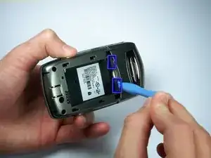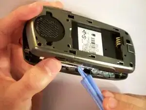 Поверните телефон боком и отожмите шарнир с одной стороны телефона, нажав внутрь и повернув в сторону пластиковым инструментом для вскрытия.