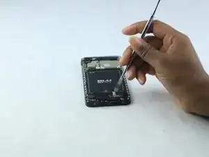 Осторожно просуньте медиатор между чёрной звуковой платой (расположена под аккумулятором).