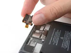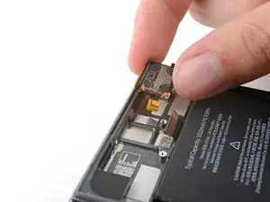 Удерживайте правый край динамика уха и потяните его в сторону от рамы, чтобы отделить клей разъёма.