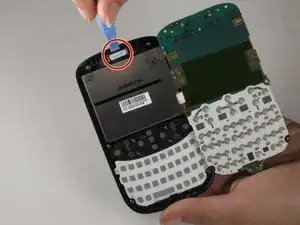 Вставьте палец или монтажную лопатку в паз над аккумулятором. Снимите аккумулятор и отложите в сторону.